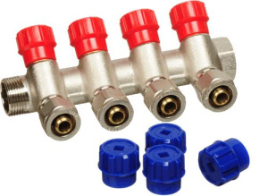 Коллектор 4 отвода с шаровыми клапанами 3/4"x1/2""(16) Stout (латунь, синие ручки) (SMB-6201-341204)