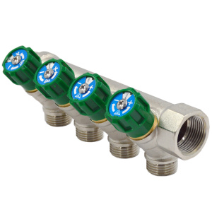 Коллектор с регулируемыми кранами нужен для того, чтобы потоки теплоносителя распределялись грамотно и равномерно по всем контурам системы отопления. В противном случае, при неравномерном распределении воды могут образовываться застои и воздушные пробки. Коллектор с регулирующими вентилями может быть разных видов, например, с двумя, тремя или четырьмя элементами регулировки. Такие детали изготавливают методом горячего прессования, корпус чаще всего производят из латуни, а сверху на него наносят слой никеля. Такие материалы отлично реагируют на воздействие внешней и внутренней среды. Коллектор с регулируемыми выходами имеет свои особенности каждой модели, они отличаются количеством выходов и диаметром резьбы.