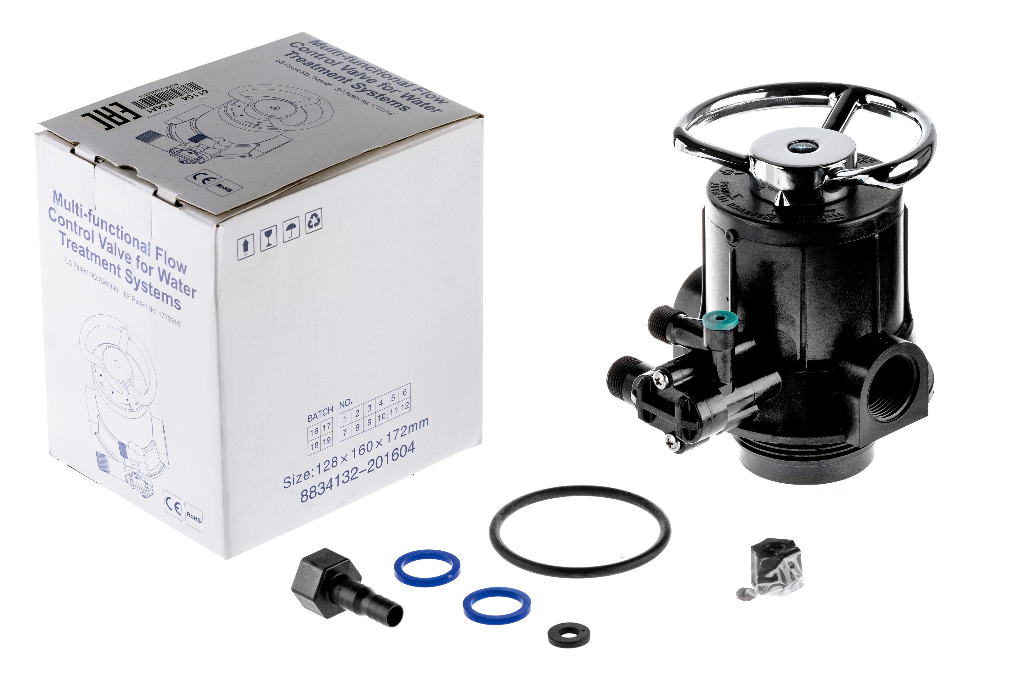 Адаптер для умягчителя Runxin М-77 (в сборе), арт. 34230 предназначен для промышленных умягчителей и применяется для ручного управления потоками воды внутри корпуса скорого фильтра с зернистой загрузкой. Адаптер оснащен пятью режимами работы: рабочий, обратная промывка загрузки потоком исходной воды, регенерация загрузки реагентом, поступающим из бака посредством встроенного инжектора, отмывка загрузки от излишков реагента, наполнение бака водой для подготовки регенерирующего раствора. Имеет дисковую конструкцию клапана. Диски разделены перегородками на секции. При выборе определенного режима работы адаптера происходит совмещение соответствующих секций, тем самым регулируется поток воды.