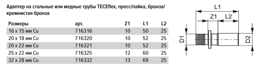 Адаптер с трубы из нержавеющей стали или меди на систему TECEflex. Подходит для пресс-фитингов с V- или M-контурами. Также подходит для пайки.