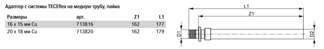 Адаптер с медных труб на систему TECEflex методом пайки. Запрещено использовать для монтажа систем газоснабжения.