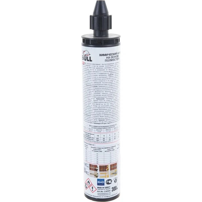 Химический анкер на основе полиэстера Bull CA900 300 мл CA900 предназначен для надежной фиксации шпилек, шурупов, анкеров, крюков, гильз и центрирующих втулок в бетоне, природном камне и кирпиче. Входящие в состав компоненты не требуют дополнительного смешивания.