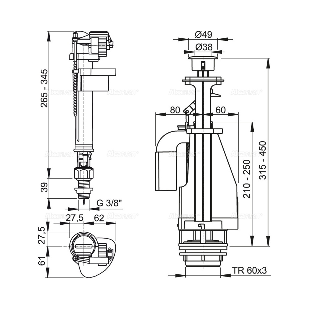 Арматура для смывного бачка Alcaplast с двойной кнопкой, впускной механизм (SA08AS 1/2" CHROM)