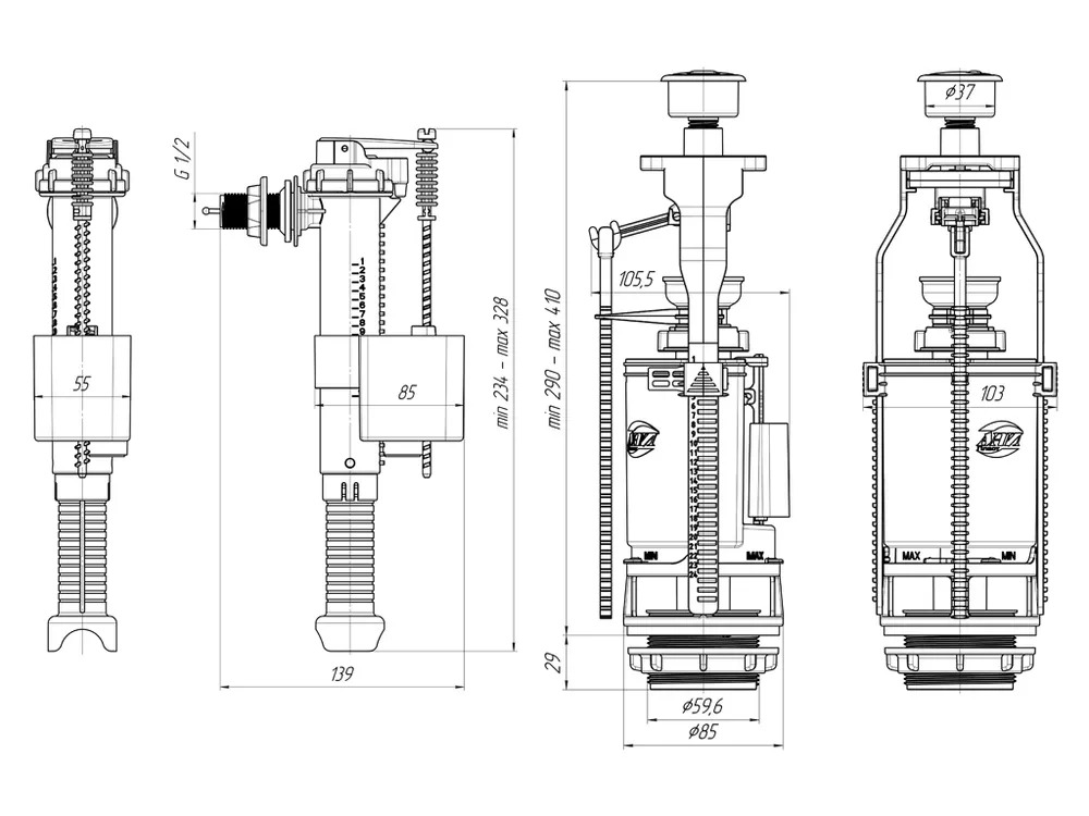 Набор для бачка унитаза АНИ пласт WC9010C. Наливной механизм с верхней боковой подводкой и пластиковой резьбой диаметром 1/2"""", регулировка по высоте 234-328 мм.