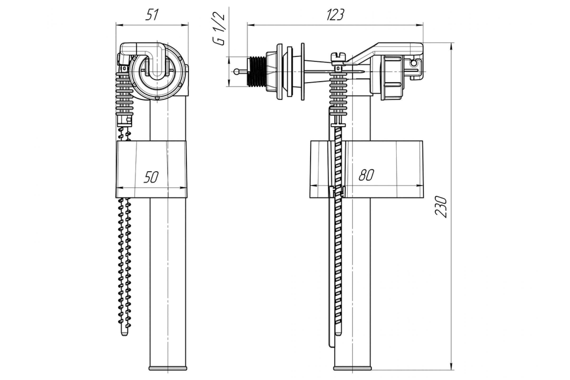 Наливной механизм бачка унитаза с боковой подводкой и пластиковой резьбой диаметром 1/2 эконом