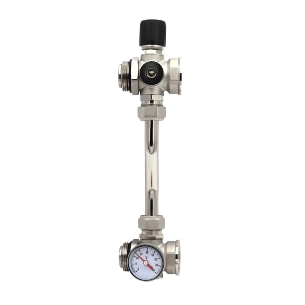 Байпас применяется совместно с коллекторными группами и служит для перенаправления потока теплоносителя от подающего к обратному коллектору в случае, когда расход на подающем коллекторе уменьшается ниже значения, установленного на перепускном клапане.