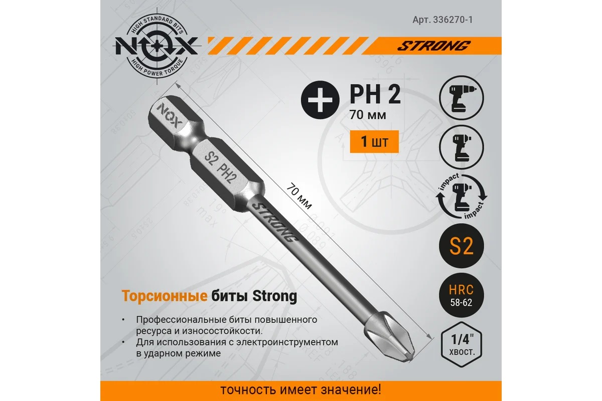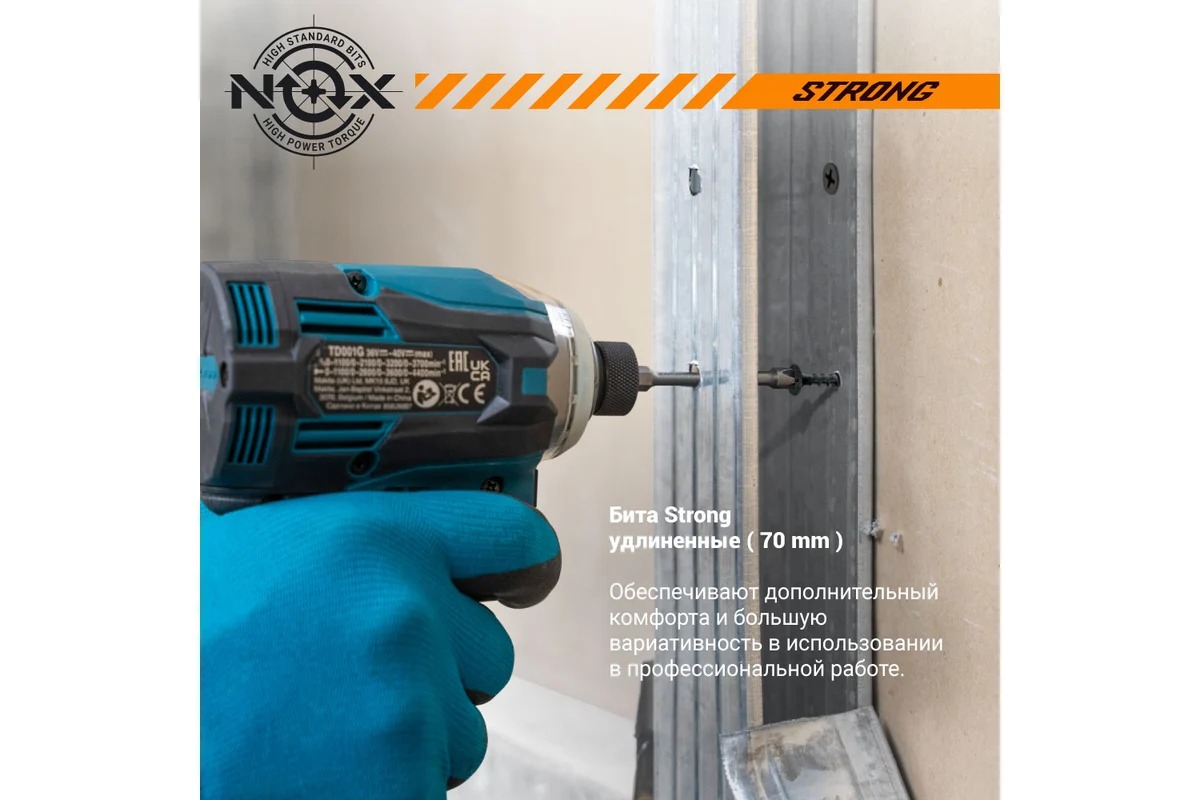 Торсионная бита NOX STRONG – профессиональная бита c повышенным ресурсом и износостойкостью. Предназначена для использования с электроинструментом в ударном режиме.