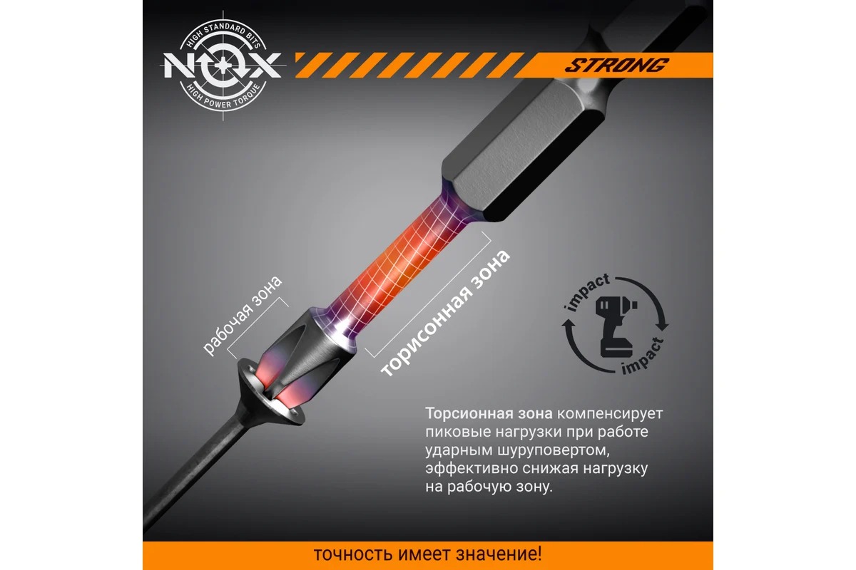 Торсионная бита NOX STRONG – профессиональная бита c повышенным ресурсом и износостойкостью. Предназначена для использования с электроинструментом в ударном режиме.