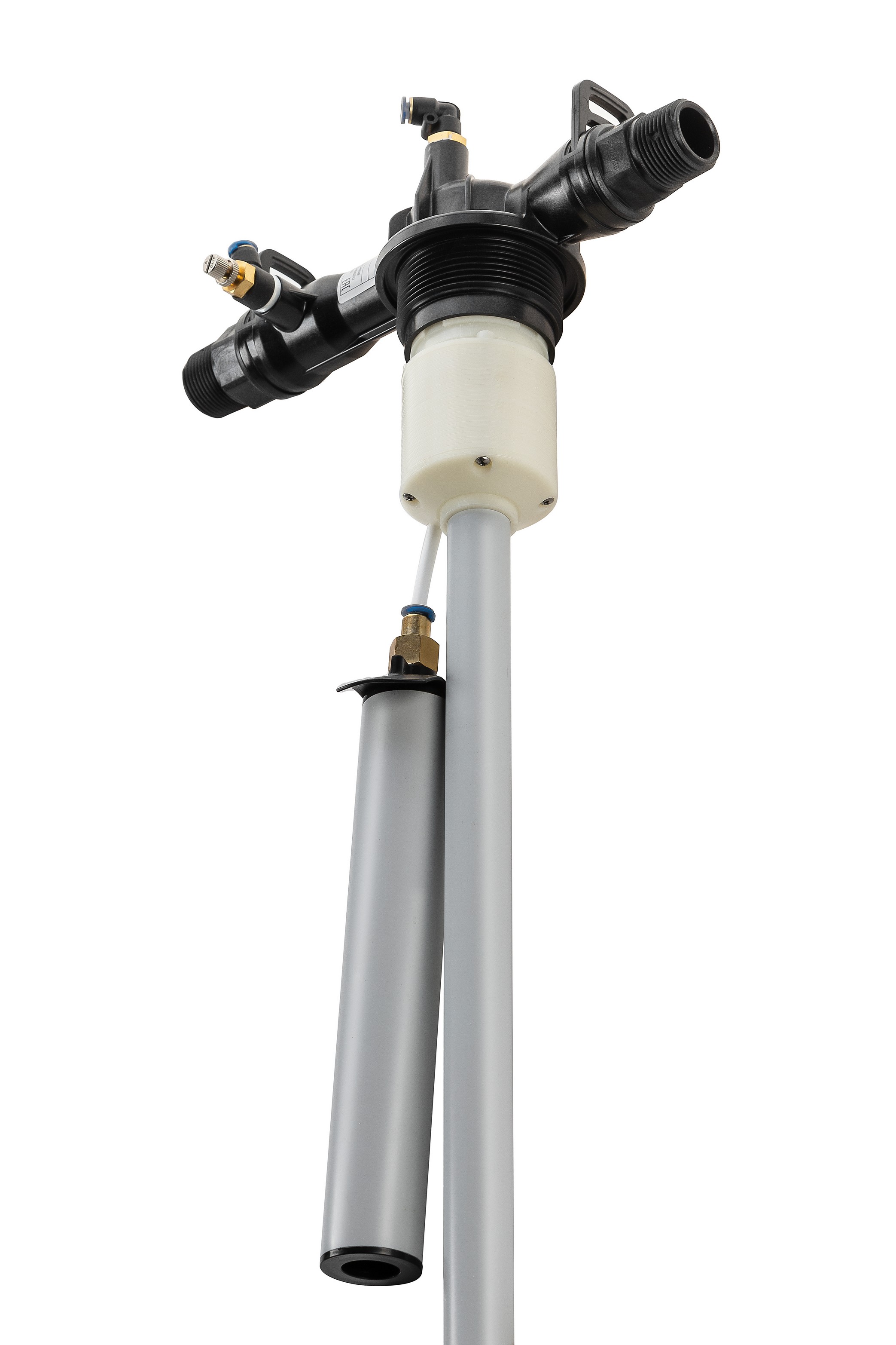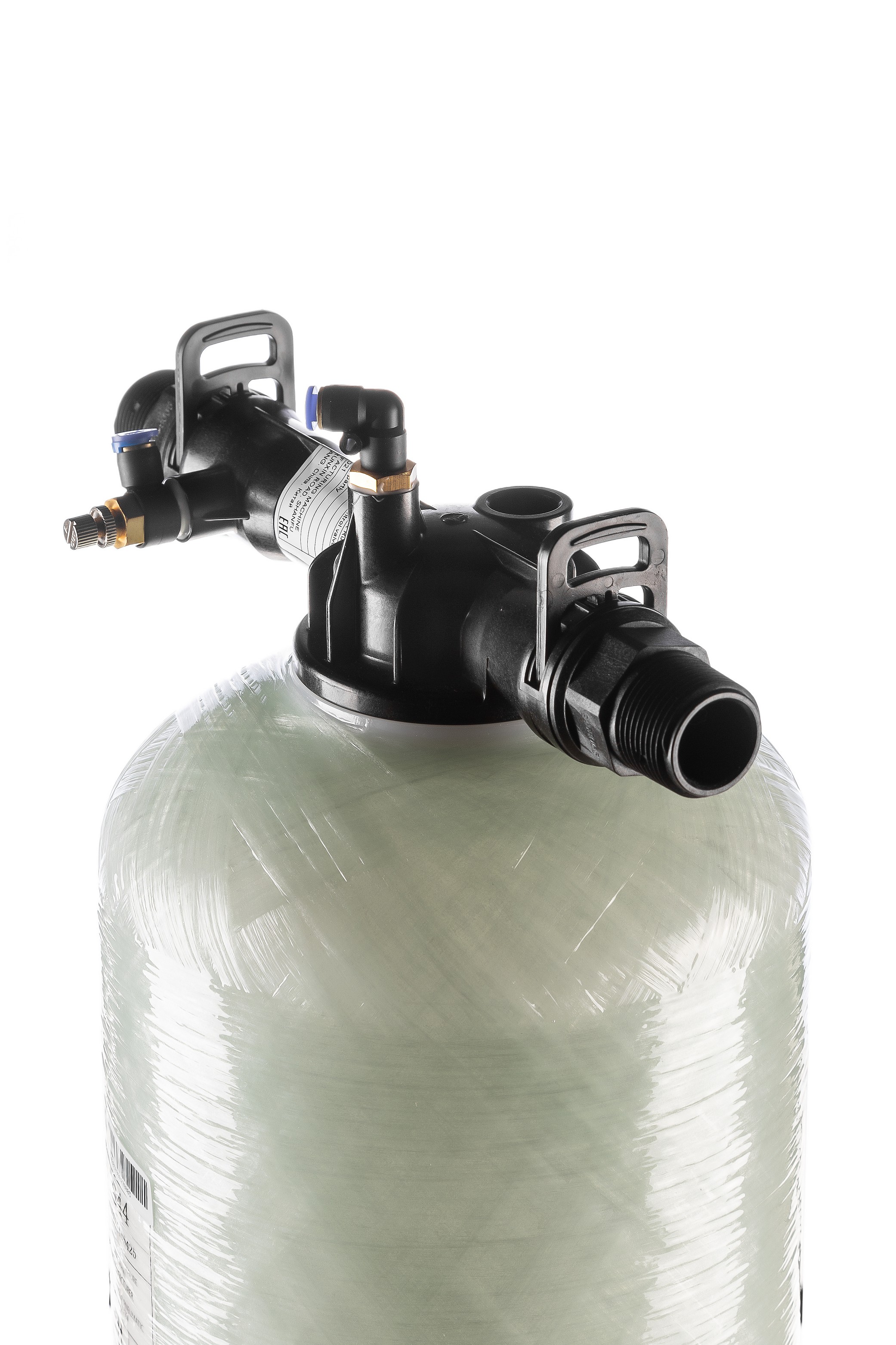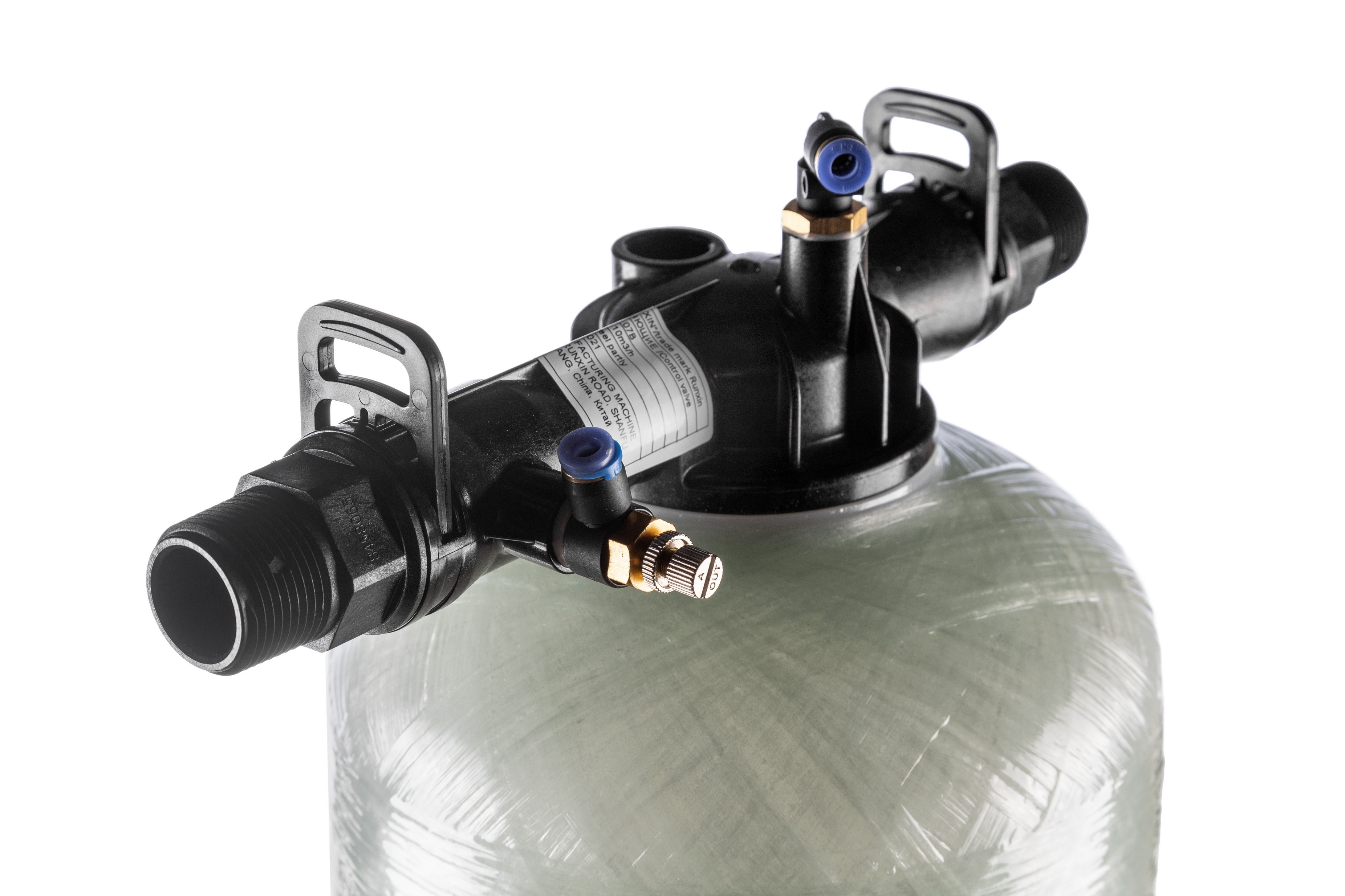 В горловину колонны с резьбой 2 1/2 вкручена распределительная шайба, имеющая с наружной стороны резьбовые отверстия для подвода и отвода воды (1”) и отвода воздуха 3/8”. С внутренней стороны отверстия имеют стандартные размеры для вклеивания труб из ПВХ.