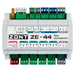 На объектах с многоконтурной системой отопления, где системой автоматизации могут быть охвачены несколько сооружений, для расширения аппаратных возможностей универсального контроллера ZONT H2000+ PRO и контроллера ZONT C2000+ применяется блок расширения ZONT ZE-44.