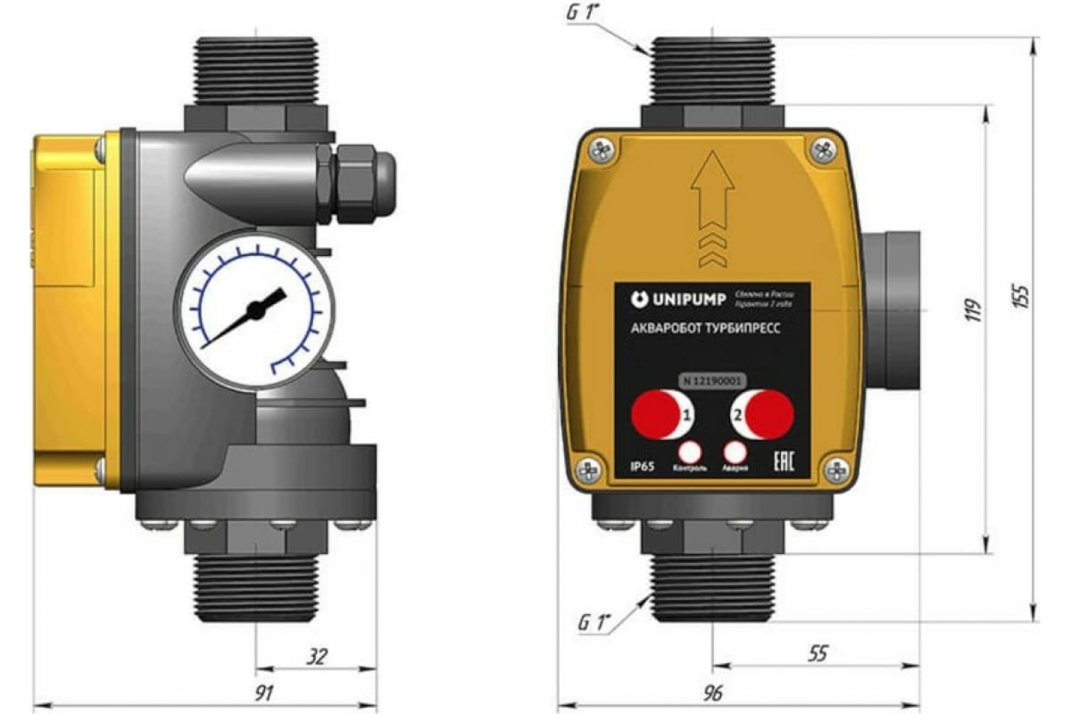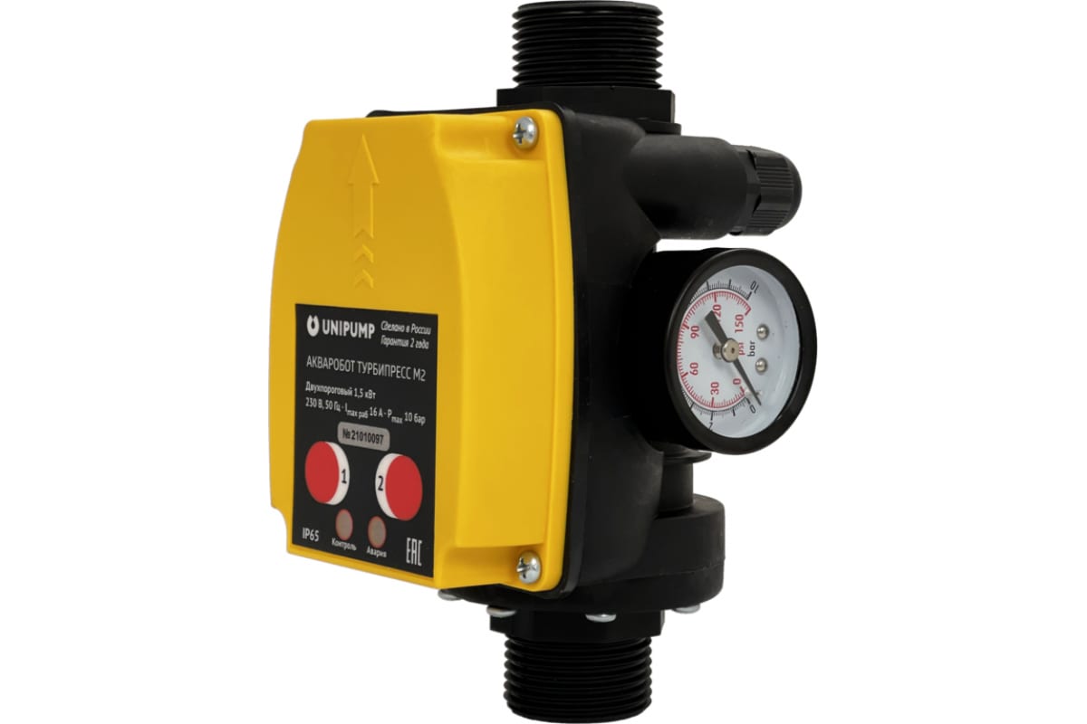 Блок автоматического управления насосом АКВАРОБОТ ТУРБИПРЕСС М2 предназначен для автоматического управления однофазными насосами мощностью до 1,5 кВт по потоку жидкости и по давлению в системе