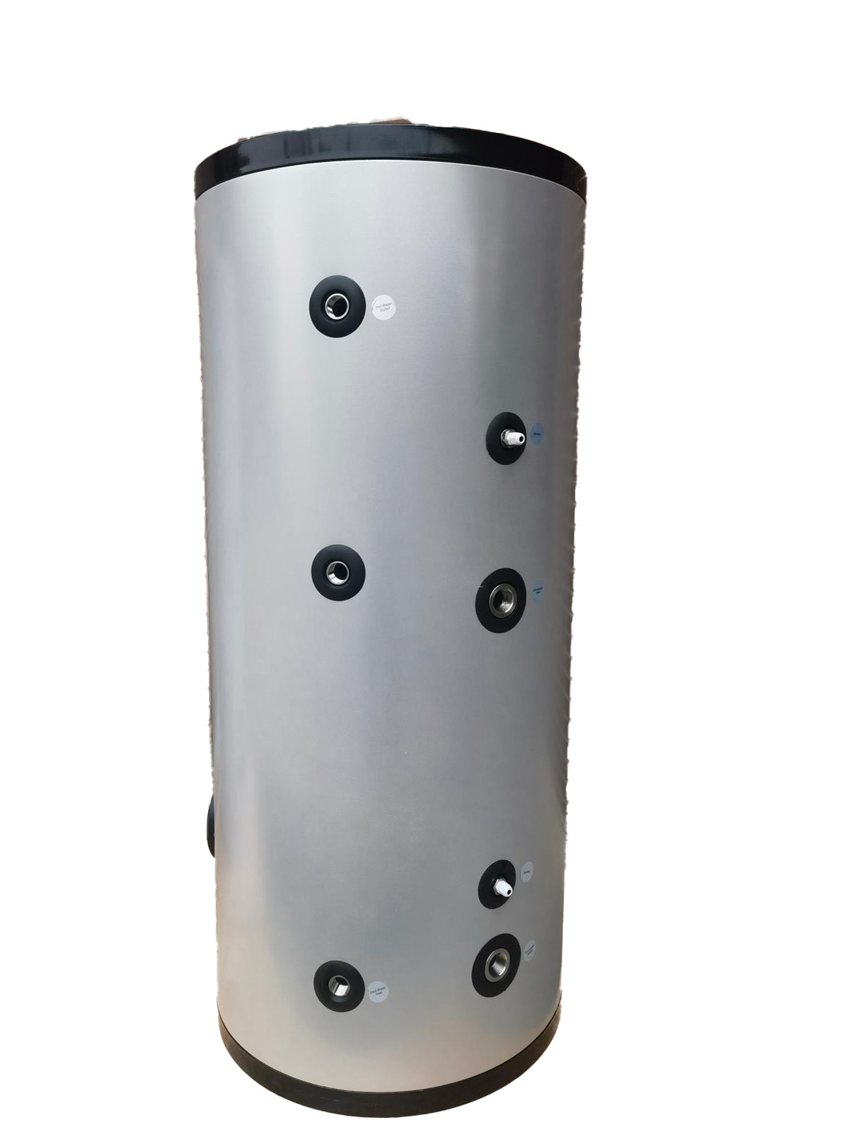 Бойлер с ревизионным фланцем также из нержавеющей стали и дренажным сливом из нижней точки бака, 2 гильзы для температурных датчиков, патрубок рециркуляции, ножки, возможность установки ТЭНа и магниевого анода