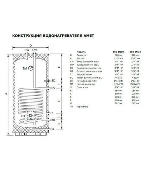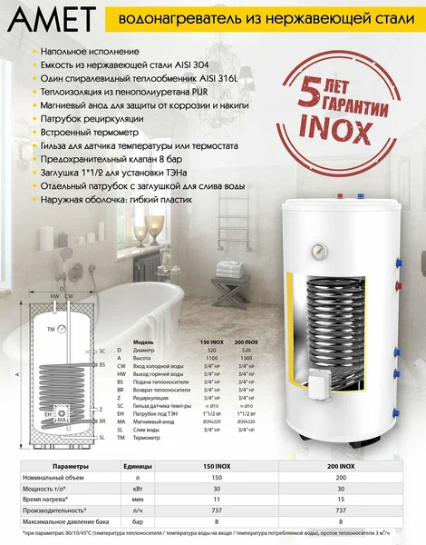 Водонагреватель косвенного нагрева Termica AMET INOX напольные - бойлер косвенного нагрева напольного типа установки. Толстый слой полиуретановой пены, используемой в качестве теплоизоляции внутреннего бака, позволяет не менее 2 суток сохранять воду в бойлере горячей, а наружную поверхность водонагревателя сохранять прохладной. Прибор оснащен магниевым анодом, предупреждающим образования на теплообменнике и/или ТЭНе накипи.