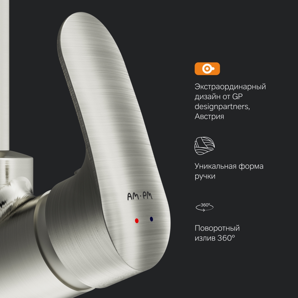 Впервые модный дизайнерский смеситель в доступном сегменте: ультрамодный стиль Dynamic Organic — природные формы в сочетании с четкими линиями доведенными до совершенства человеком. Максимальный комфорт: плавное вращение излива в любом направлении обеспечивает непревзойденное удовольствие от использования и удобство в работе на кухне.