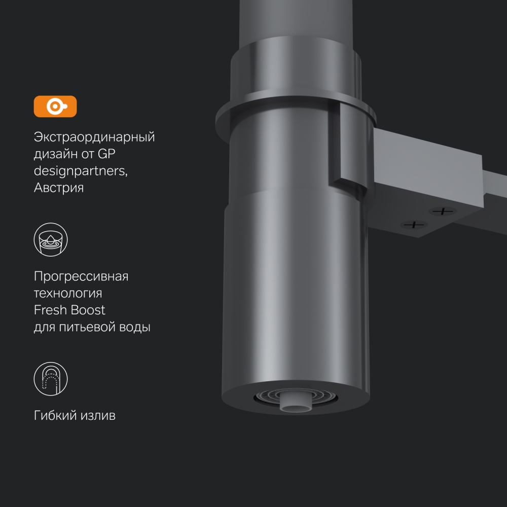 Смеситель оснащен встроенным каналом для питьевой воды. Благодаря прогрессивной технологии Fresh Boost при вращении ручки на 90 градусов вы можете наслаждаться чистой питьевой водой. Для получения обычной воды просто управляйте смесителем привычным способом.
