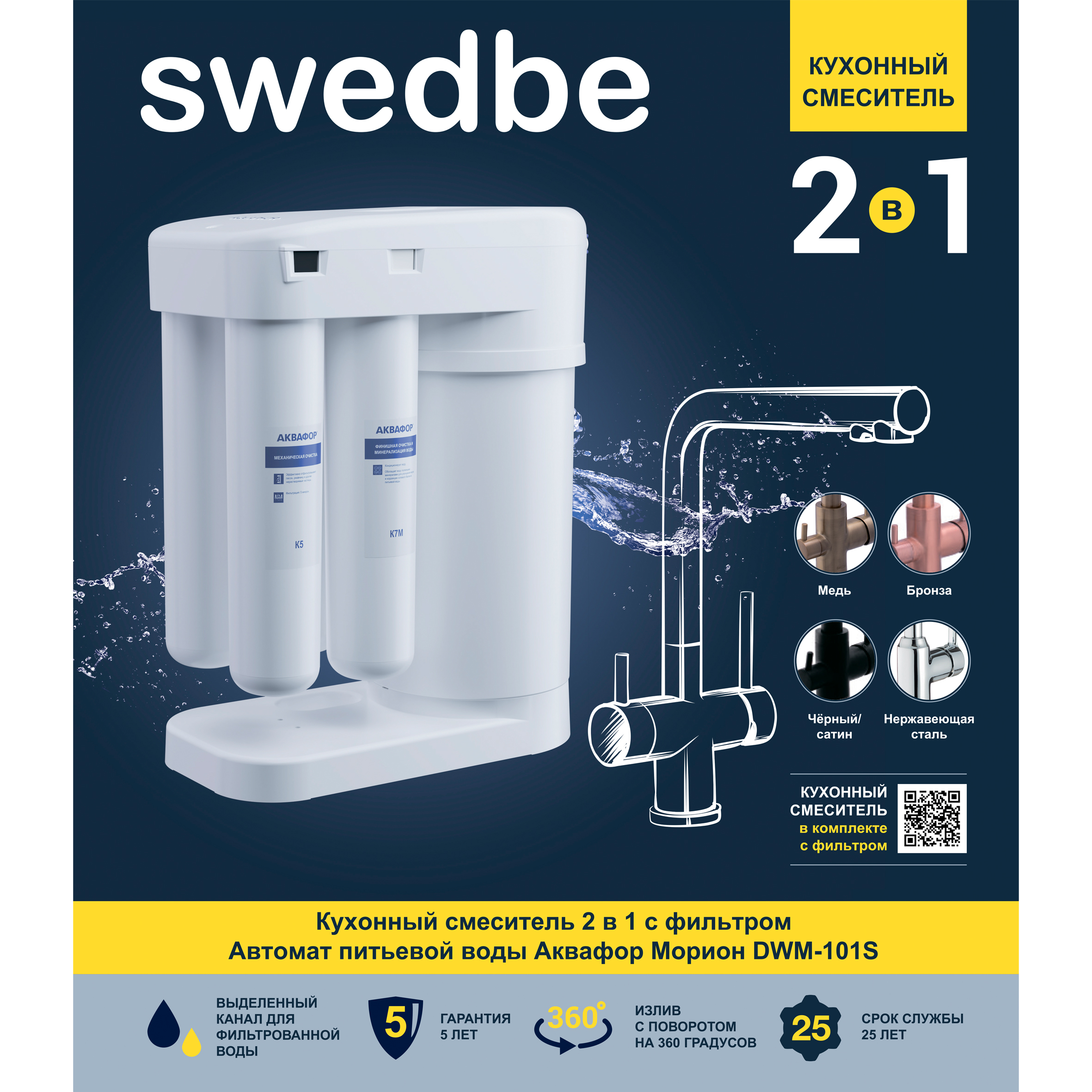 Cмеситель для кухни Swedbe Selene Plus в комплекте с фильтром Аквафор Морион нержавеющая сталь (K8042M)