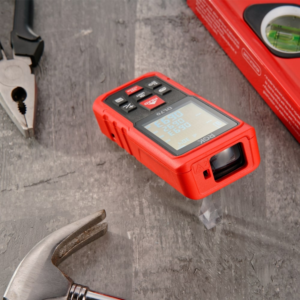 Лазерный дальномер RGK DL70 измеряет расстояния до 70 метров c точностью ±2 мм и оснащен угломером. Ключевая особенность прибора - опция "помощник маляра", которая поможет быстро вычислить сумму площадей стен помещения. Таким образом вы сможете точно рассчитать необходимый объем краски, штукатурки и других материалов.