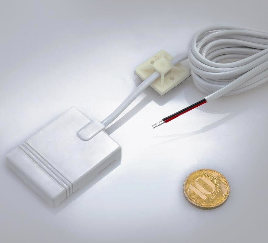 Габаритные размеры датчика протечки воды (без учета кабеля) 35х47х8 мм.