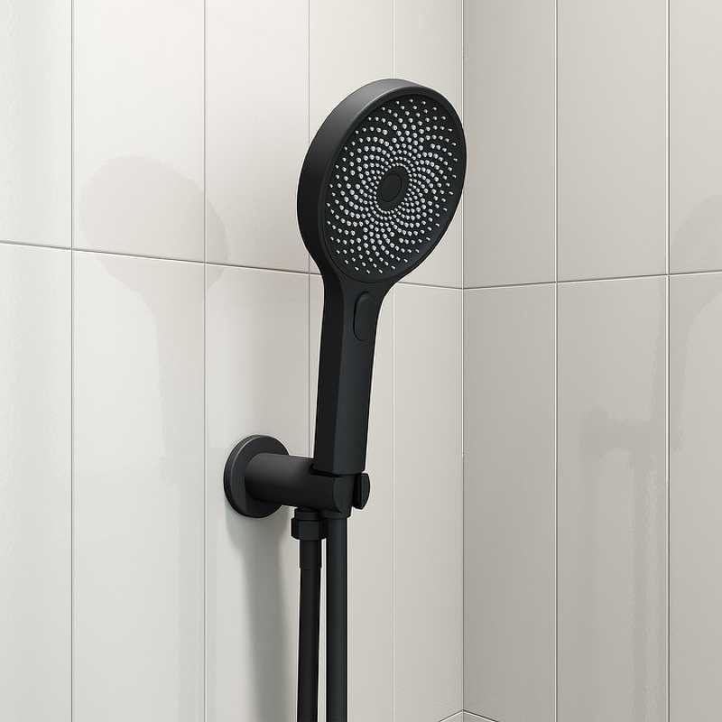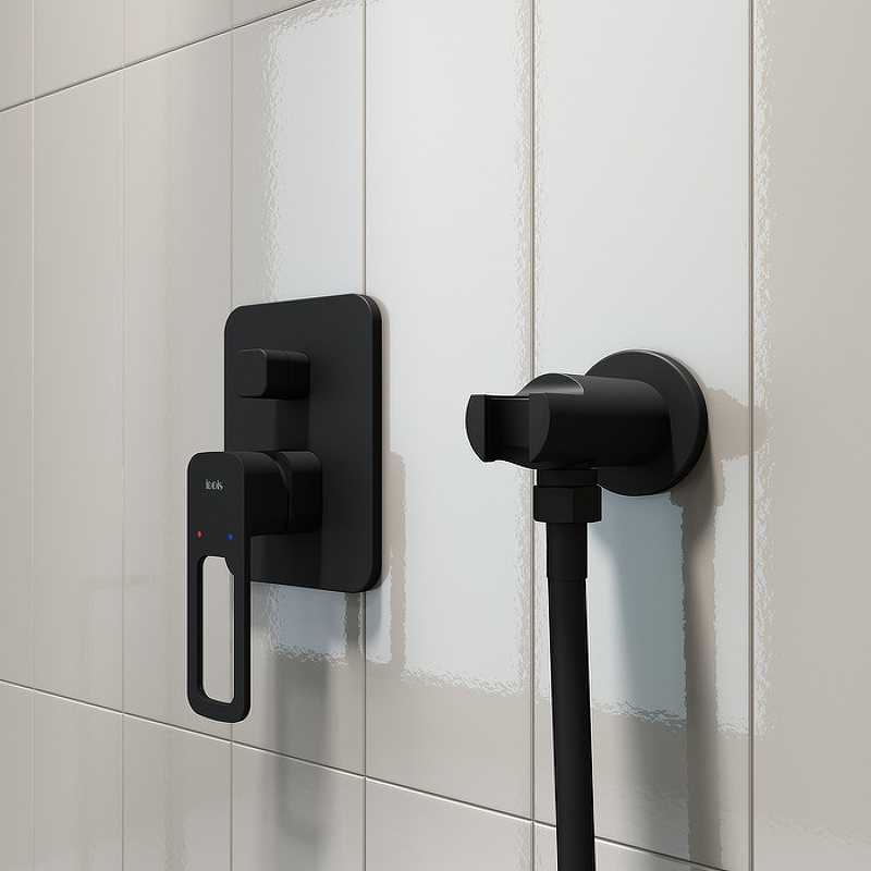 Выход для шланга с держателем для лейки, для встраиваемой системы, круглое основание, материал латунь, цвет черный, пластиковая вставка в держателе. Упаковка - картонная коробка.