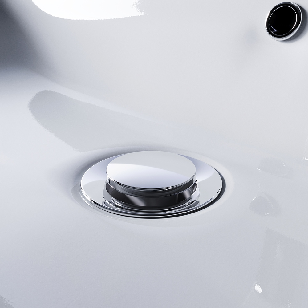 Система клик-клак управляется нажатием на пробку слива. Покрытие устойчиво к коррозии появлению царапин сколов и потускнению. Круглая заглушка в цвете хром.