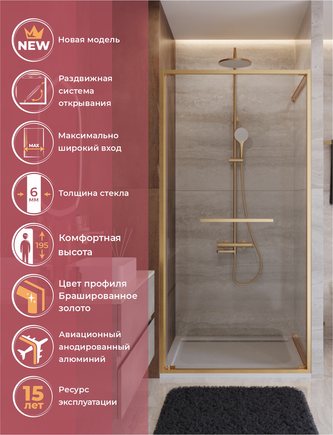 Коллекция включает шесть решений под любую задачу: квадратную (A-FS-1, A-FS-11), прямоугольную (AH-FS-1, AH-FS-11) и дверь в нишу (BF-FS-1, BF-FS-11). Высота 1950 мм и популярные размеры упрощают интеграцию в любое пространство.