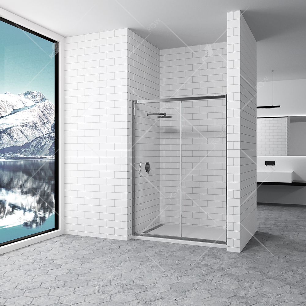 Душевая дверь состоит из 2-х секций, одно неподвижное стекло и раздвижная дверь от стены.