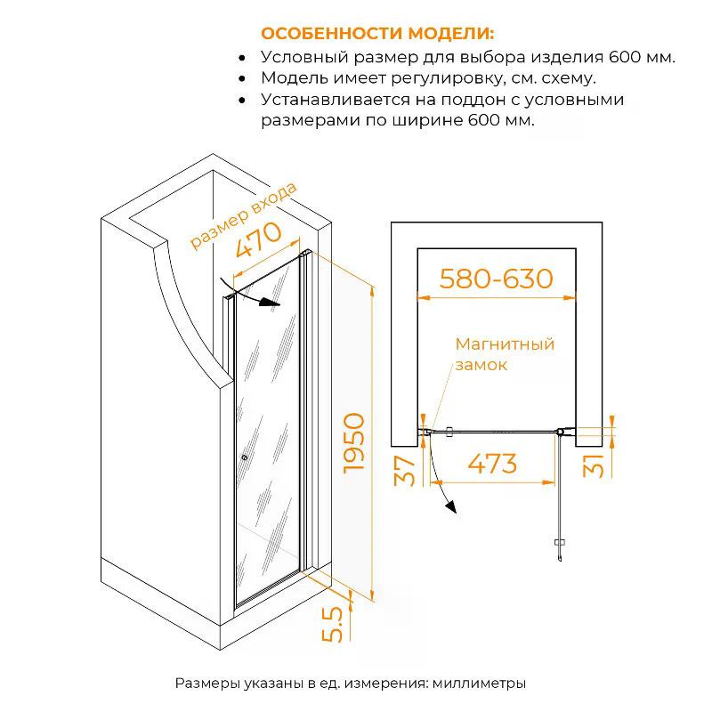 Душевая дверь RGW PA-03-B NEW 600xx1950 стекло прозрачное, профиль черный (54080306-14)