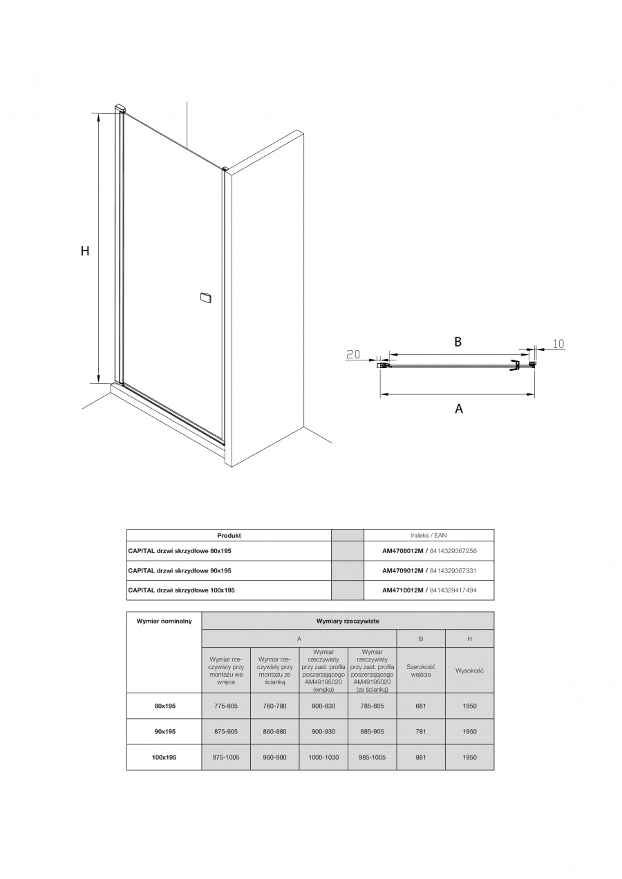 Безопасное закаленное стекло 6мм с покрытием MaxiClean Без профильная облегченная конструкция Металлические петли хром Алюминиевые хромированные профили Уплотнители высокого качества Хромированные ручки Петли с механизмом подъема и опускания Возможен монтаж без душевого поддона В случае монтажа двери в нишу необходим пристенный профиль с магнитным уплотнителем, артикул: AM48195020-хром - заказывается отдельно. При использовании профиля AM48195020 дверь открывается только наружу.