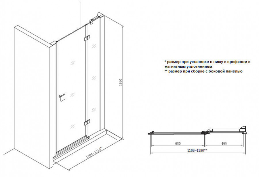 Без профильная облегченная конструкция Безопасное закаленное стекло 8 мм с покрытием MaxiClean Латунные хромированные петли Алюминиевые хромированные профили Высококачественные уплотнители Ручки из хромированной латуни Хромированный держатель стекла в комплекте Возможен монтаж без душевого поддона. Хромированный держатель стекла в комплекте