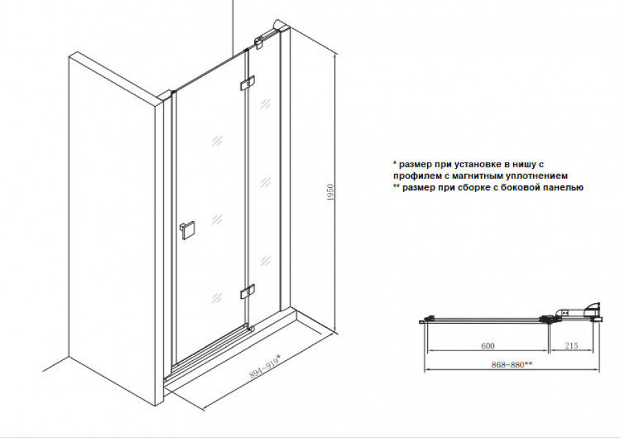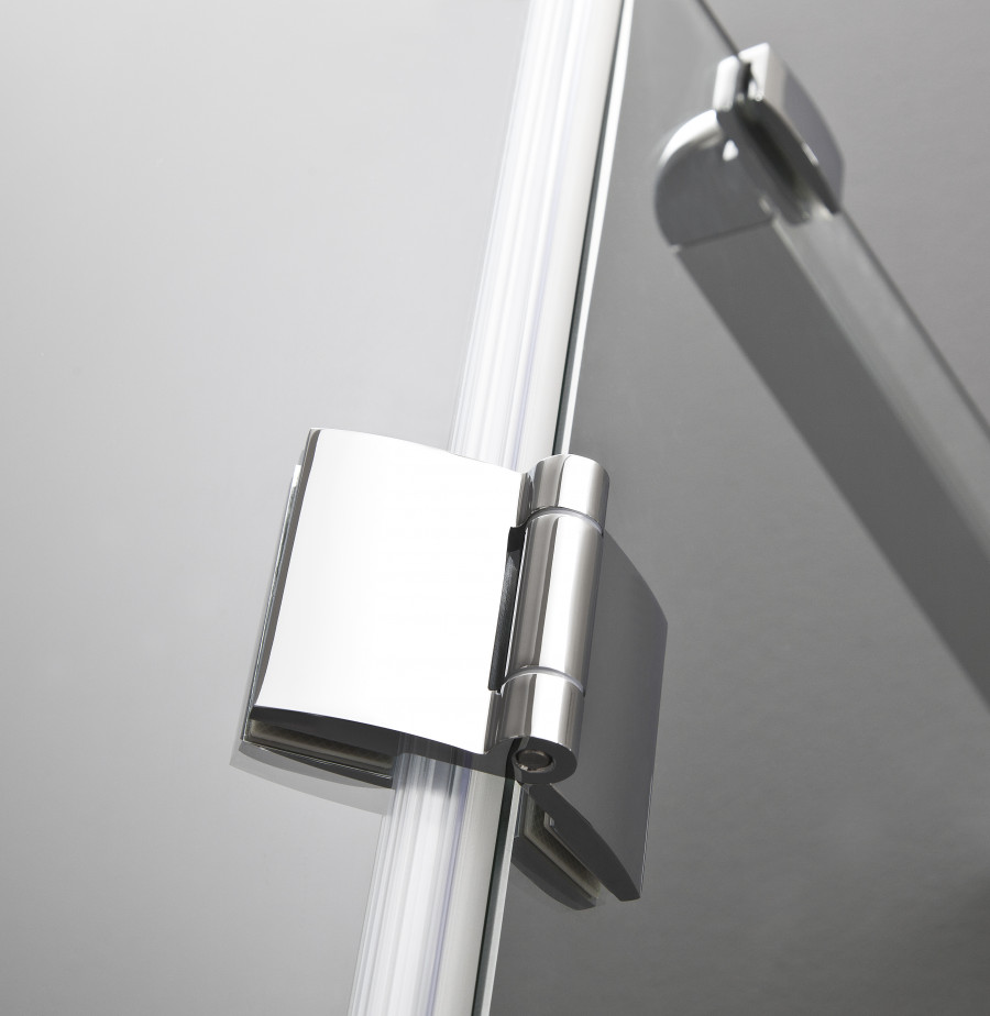 Без профильная облегченная конструкция Безопасное закаленное стекло 8 мм с покрытием MaxiClean Латунные хромированные петли Алюминиевые хромированные профили Высококачественные уплотнители Ручки из хромированной латуни Хромированный держатель стекла в комплекте Возможен монтаж без душевого поддона. Хромированный держатель стекла в комплекте