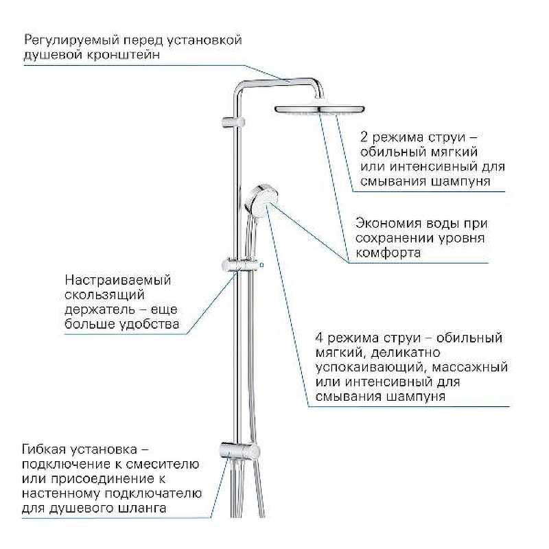 - Переключатель на 3 положения: верхний душ, ручной душ, верхний душ с Eco-режимом