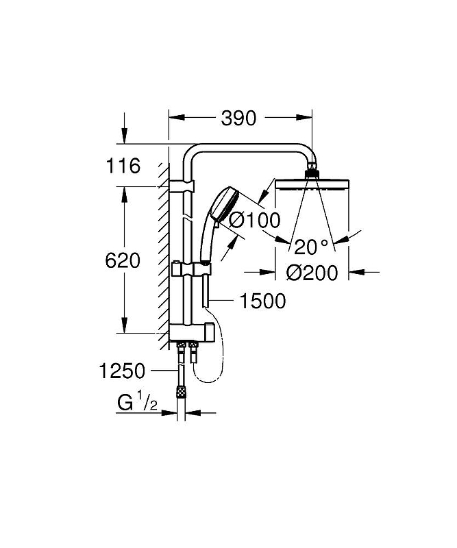 - Горизонтальный душевой кронштейн длиной 39 см регулируется перед установкой.