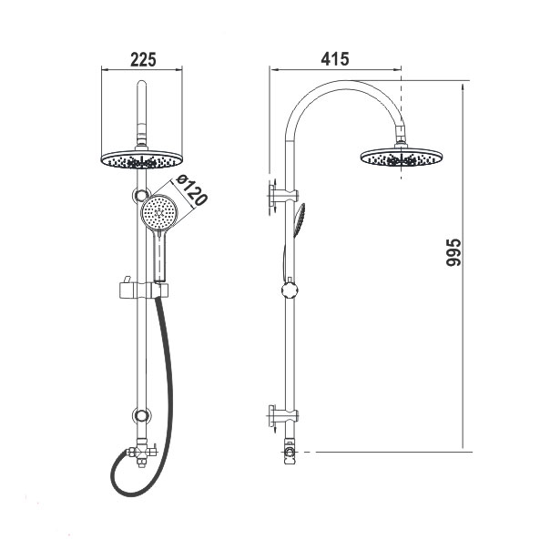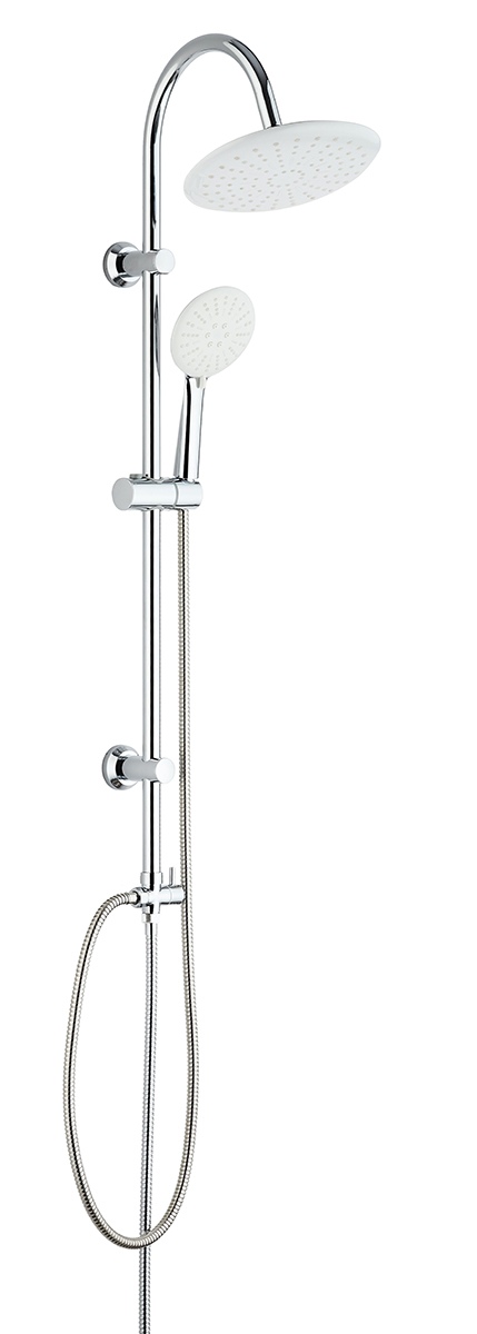 Хромированная душевая система без смесителя: держатель верхнего душа из нержавеющей стали 950х340х?22мм, верхний душ ABS ?235мм, ручной душ 120мм 3 функции, шланг хром 1,5 м, дивертор металлический на 2 положения.