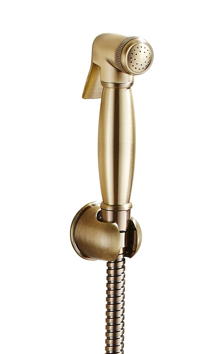 Готовое решение - в набор входит: Гиг. лейка латунная(бронза сатин): 1 режим, Eco system, держатель настенный латунный: вертикальный статичный, душевой шланг 1,2м: в металл. оплетке, цвет - бронза сатин