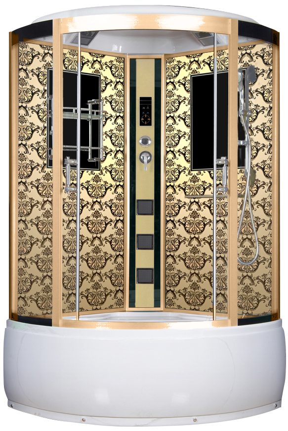 Угловая душевая кабина Niagara 7744G обладает внушительными габаритами. Она выполнена в форме четверти круга, имеет полностенное ограждение и высокий акриловый поддон. Дизайн соответствует пышному стилю барокко. В цветовом оформлении данной модели преобладает золотой цвет и его оттенки. На золотистом фоне задних стеклянных стенок контрастно нанесён темный узор в виде изысканного орнамента. Матовый профиль и душевая панель также выполнены в золотистом цвете. Раздвижные двери сделаны из прозрачного безопасного стекла и дополнены массивными металлическими ручками.
