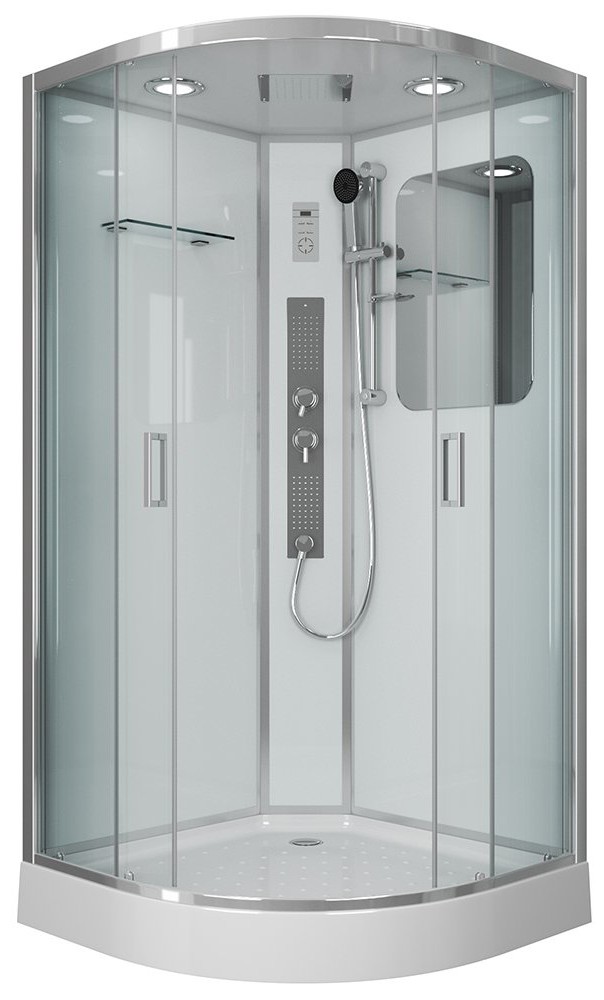 Комплектация: зеркало, полочка, душевая лейка, тропический душ, вентиляция, смеситель классический.