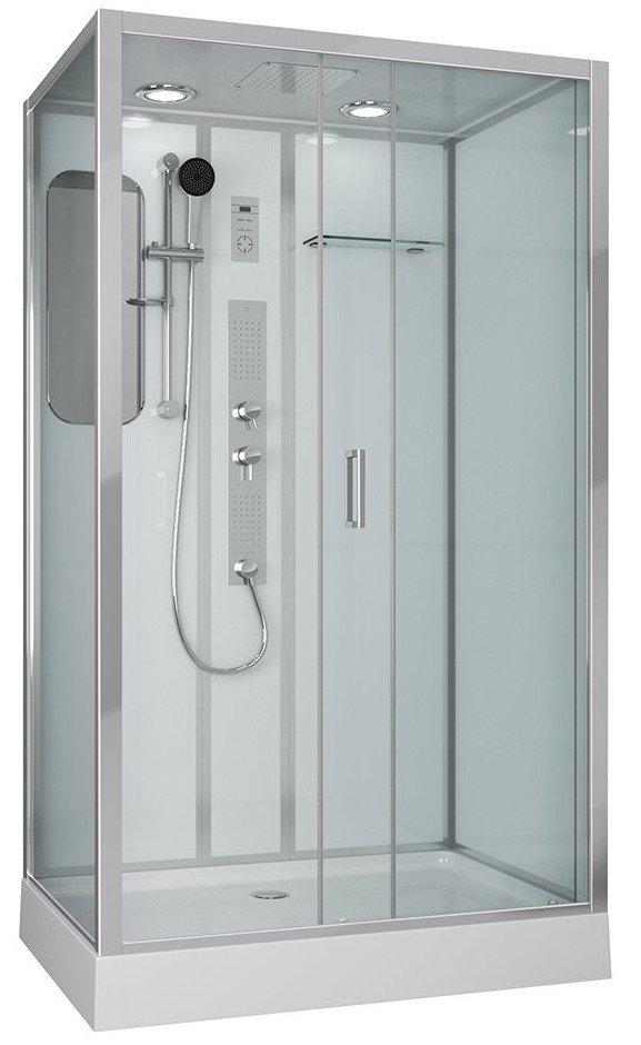 Комплектация: зеркало, полочка, душевая лейка, тропический душ, вентиляция, смеситель классический.