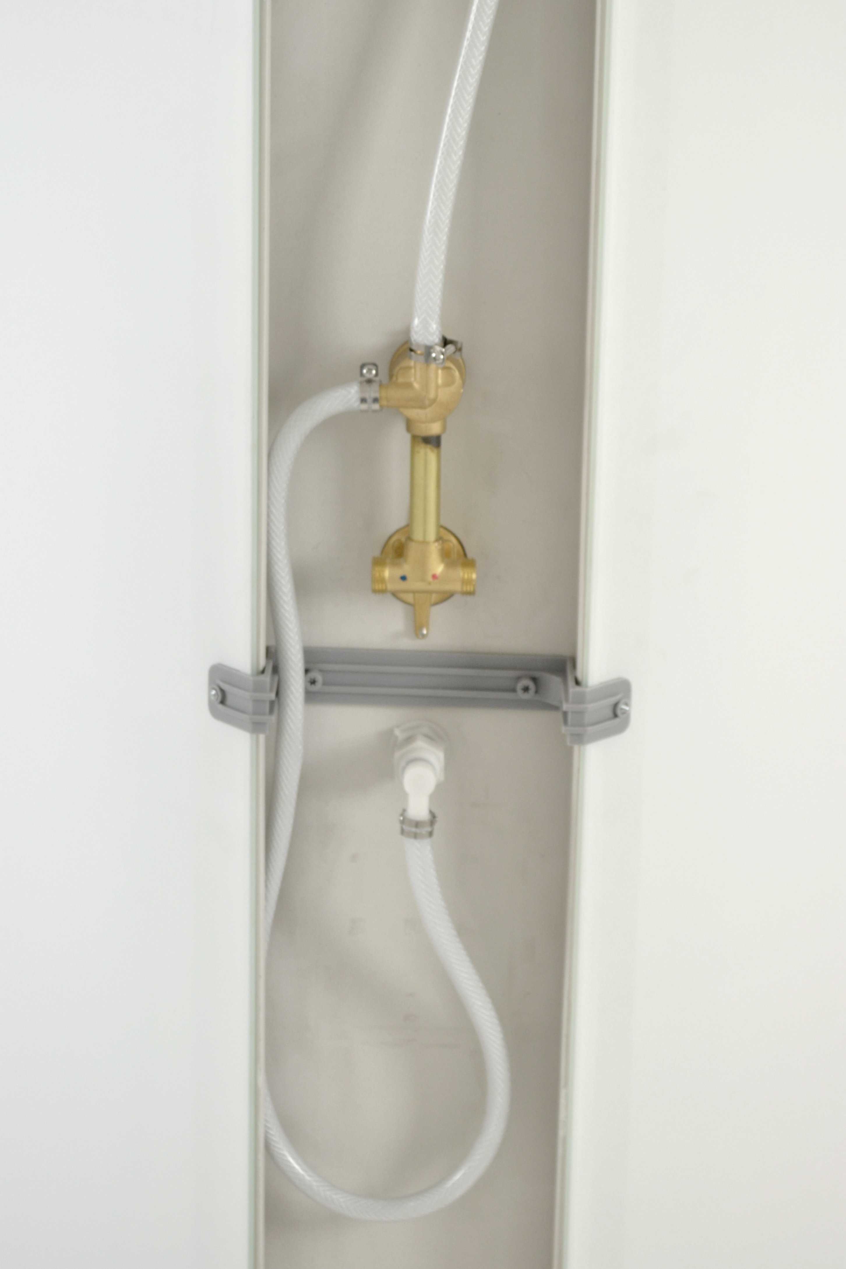 100% защита от протечек. Отсутствие соединений и шлангов за стенками кабины. Все внутренние соединения в теле смесителя, который находится внутри кабины.
