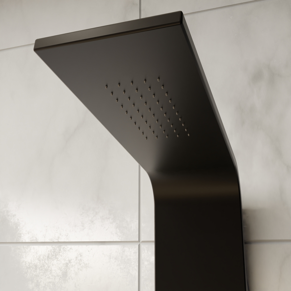 Востребованность душевой панели ShowerPanels от немецкой компании RGW объясняется оптимальным соотношением между ценой и качеством. Прочная алюминиевая конструкция с черной матовой поверхностью выполнена в стиле хай-тек. Она оснащена смесителем с керамическим картриджем и трехпозиционным дивертором, который фиксируется при переключении режимов. Излив с аэратором, создающим объемную струю за счет насыщения воды воздухом, способствует экономичному расходованию воды. Гибкий шланг из нержавеющей стали длиной 1,5 м обладает высокой износостойкостью. Для оздоравливающего и расслабляющего массажа предусмотрено три форсунки из ABS-пластика.