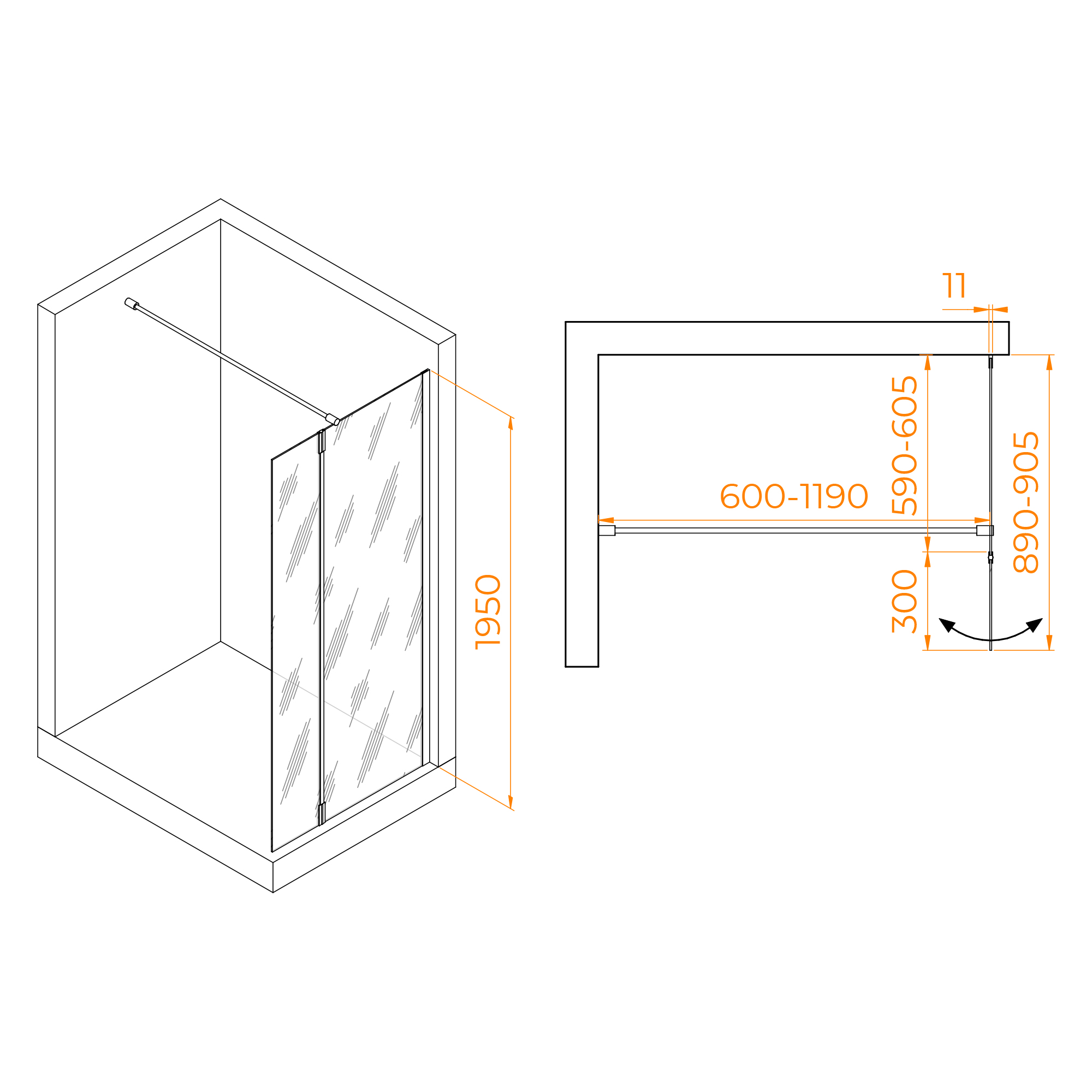 Душевая перегородка стационарная с поворотной маятниковой частью 300 мм