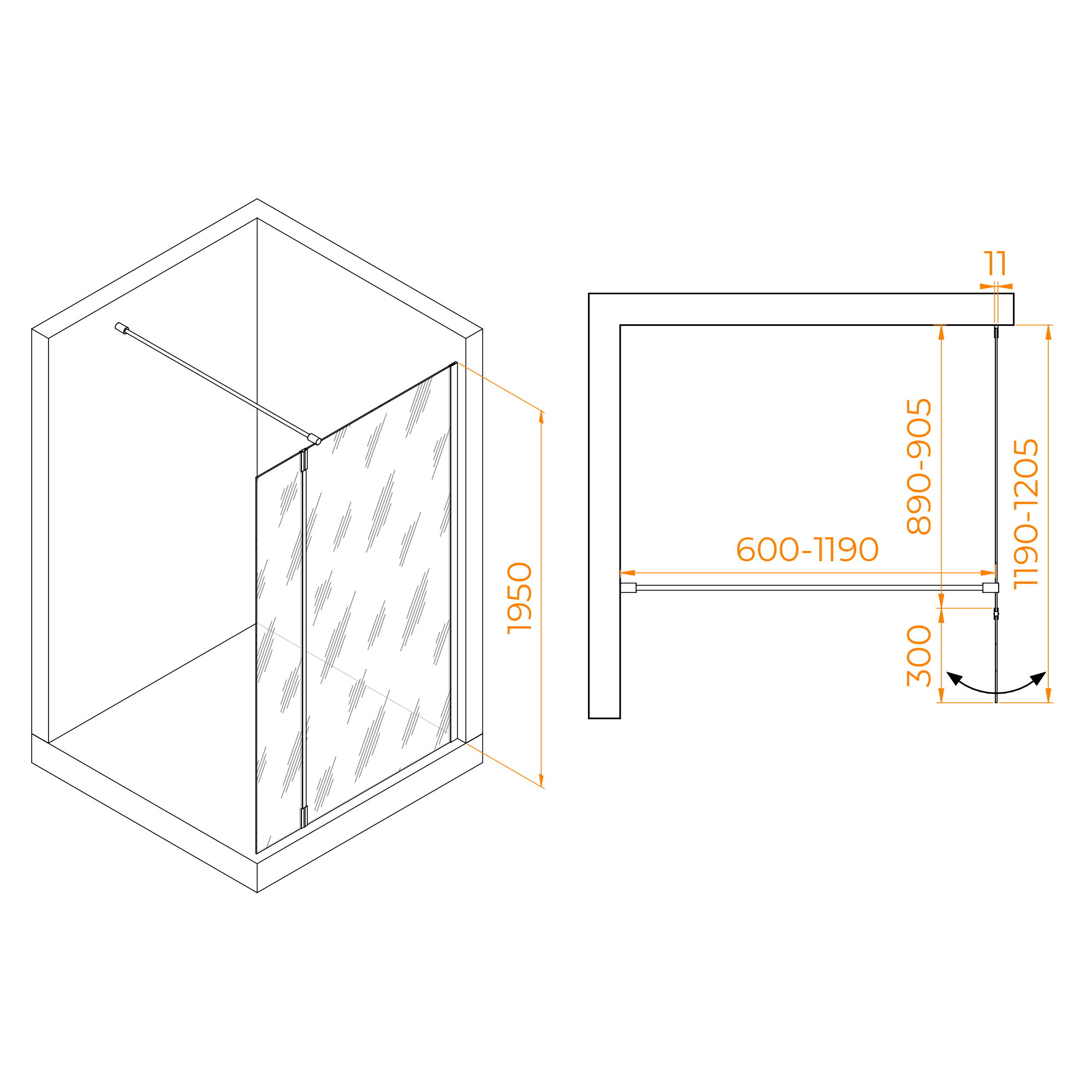 Душевая перегородка стационарная с поворотной маятниковой частью 300 мм