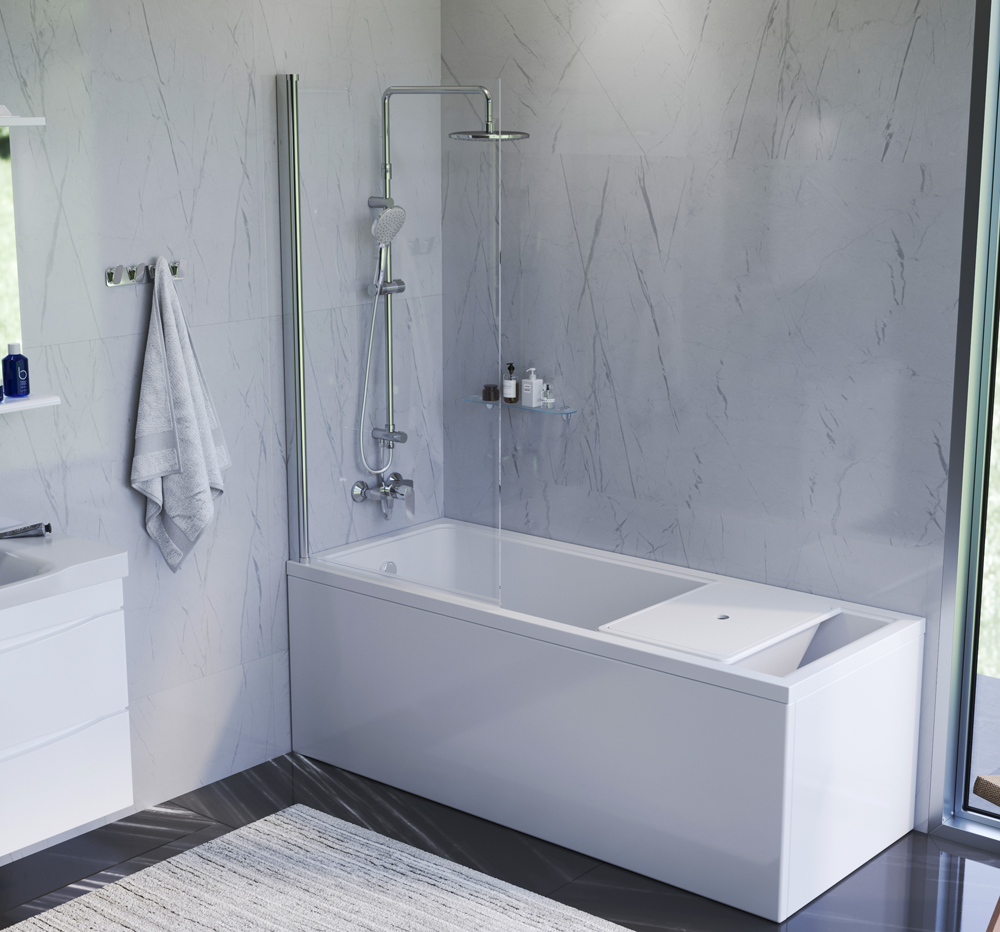 Шторка на борт ванны Gem выполнена в соответствующем всей коллекции дизайне: чистые грани четкие формы и безупречный стиль.