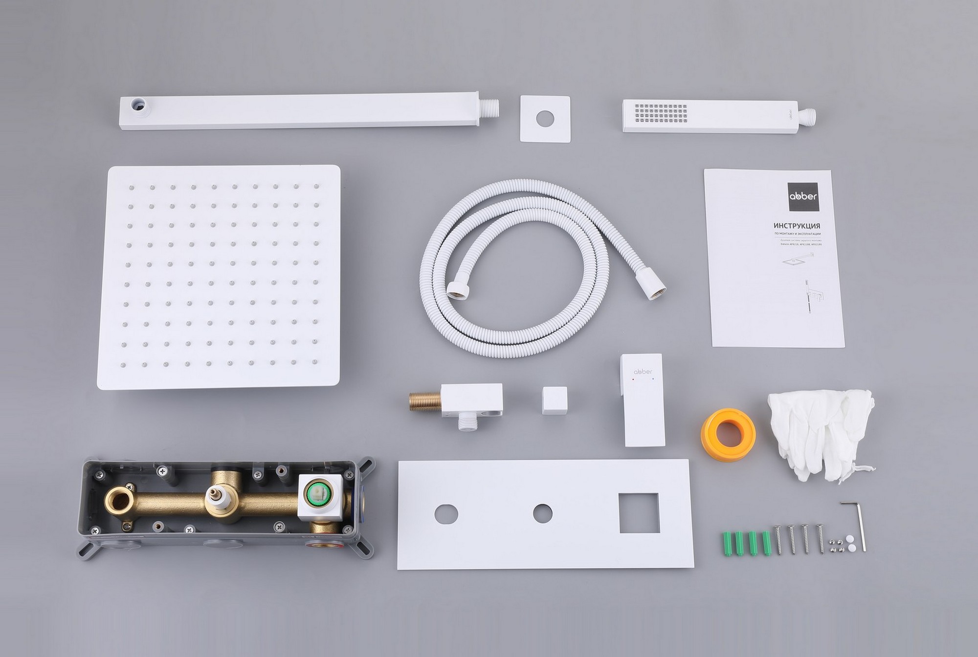 Состав поставки: смеситель внешняя и внутренняя часть, верхний душ, душевая лейка, держатели, душевой шланг
