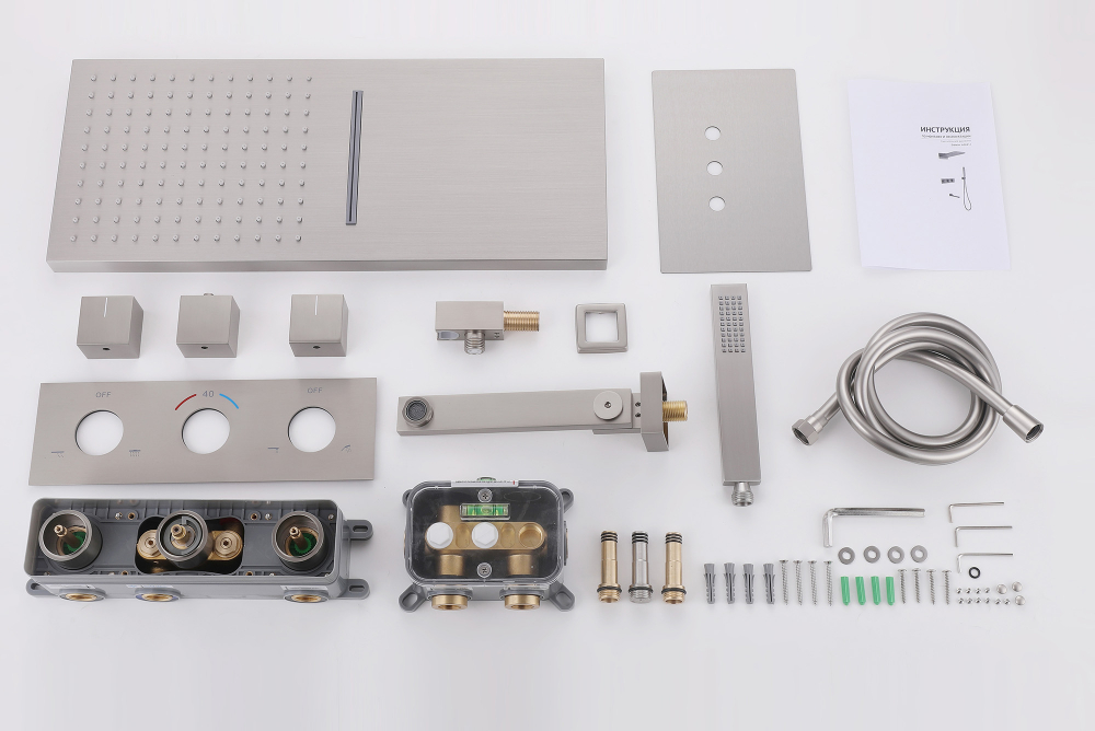 Состав поставки: смеситель внешняя и внутренняя часть, верхний душ, душевая лейка, держатели, душевой шланг, излив