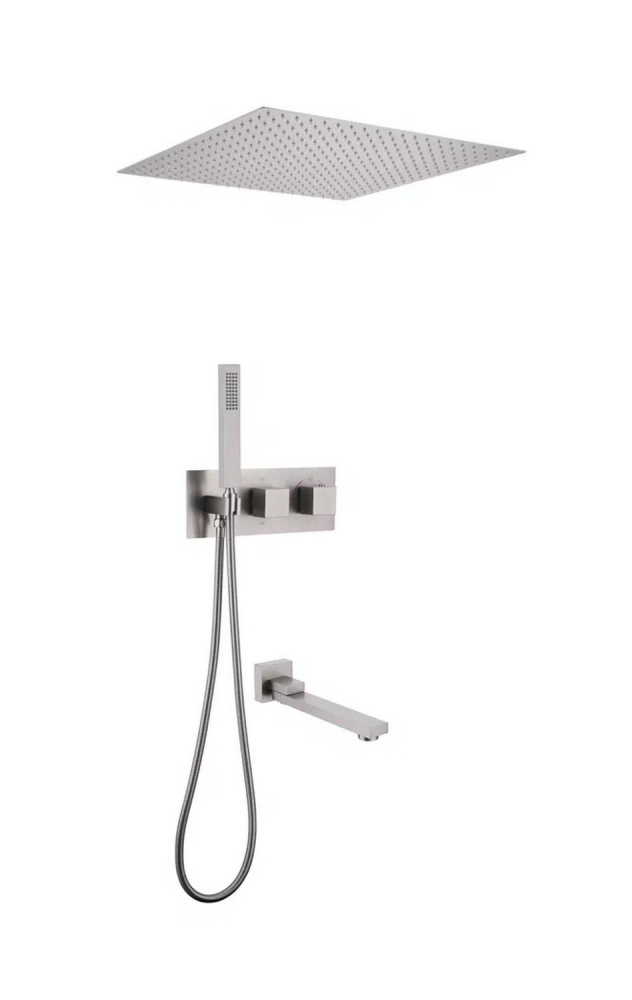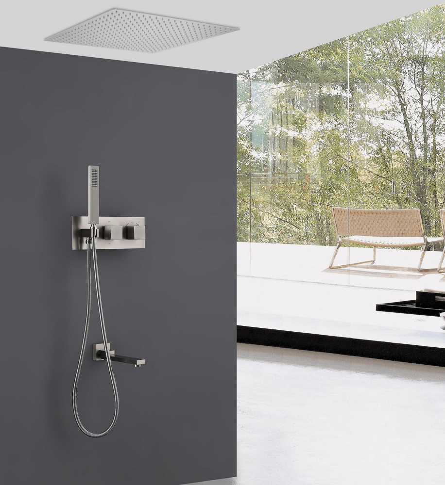 Состав поставки: смеситель внешняя и внутренняя часть, верхний душ, душевая лейка, держатели, душевой шланг, излив