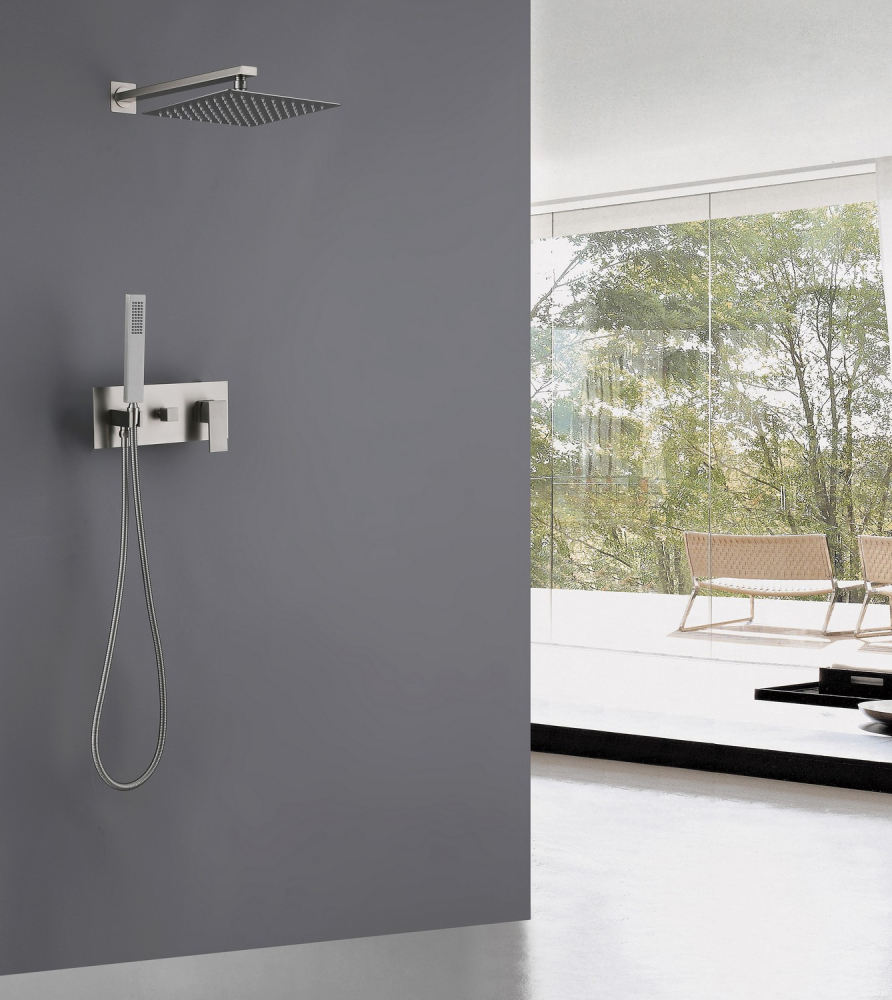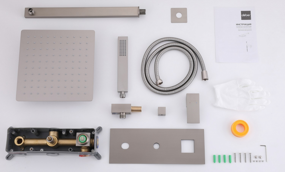 Состав поставки: смеситель внешняя и внутренняя часть, верхний душ, душевая лейка, держатели, душевой шланг