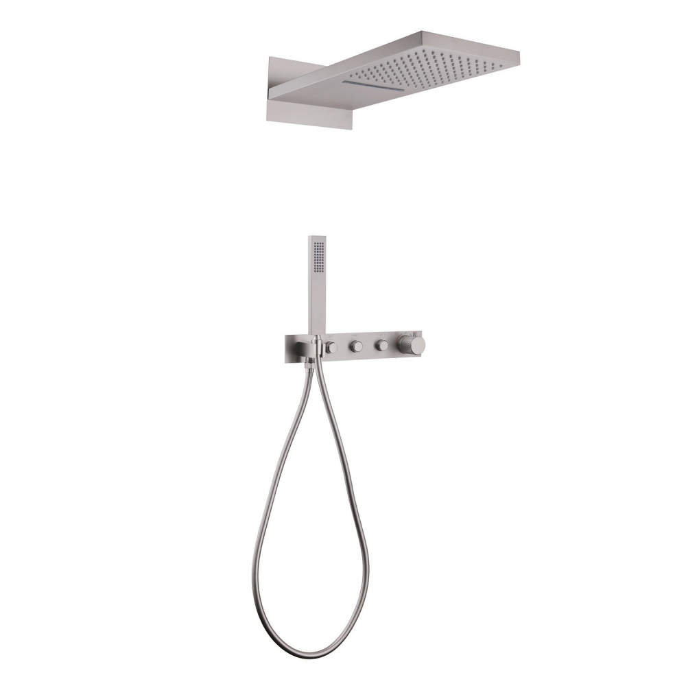 Состав поставки: смеситель внешняя и внутренняя часть, верхний душ, душевая лейка, держатели, душевой шланг