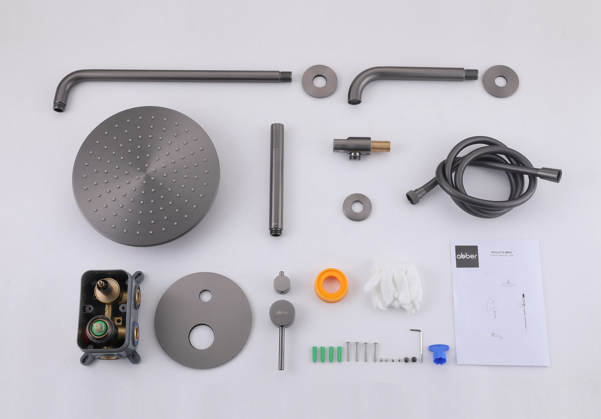 Состав поставки: смеситель внешняя и внутренняя часть, верхний душ, душевая лейка, держатели, душевой шланг, излив