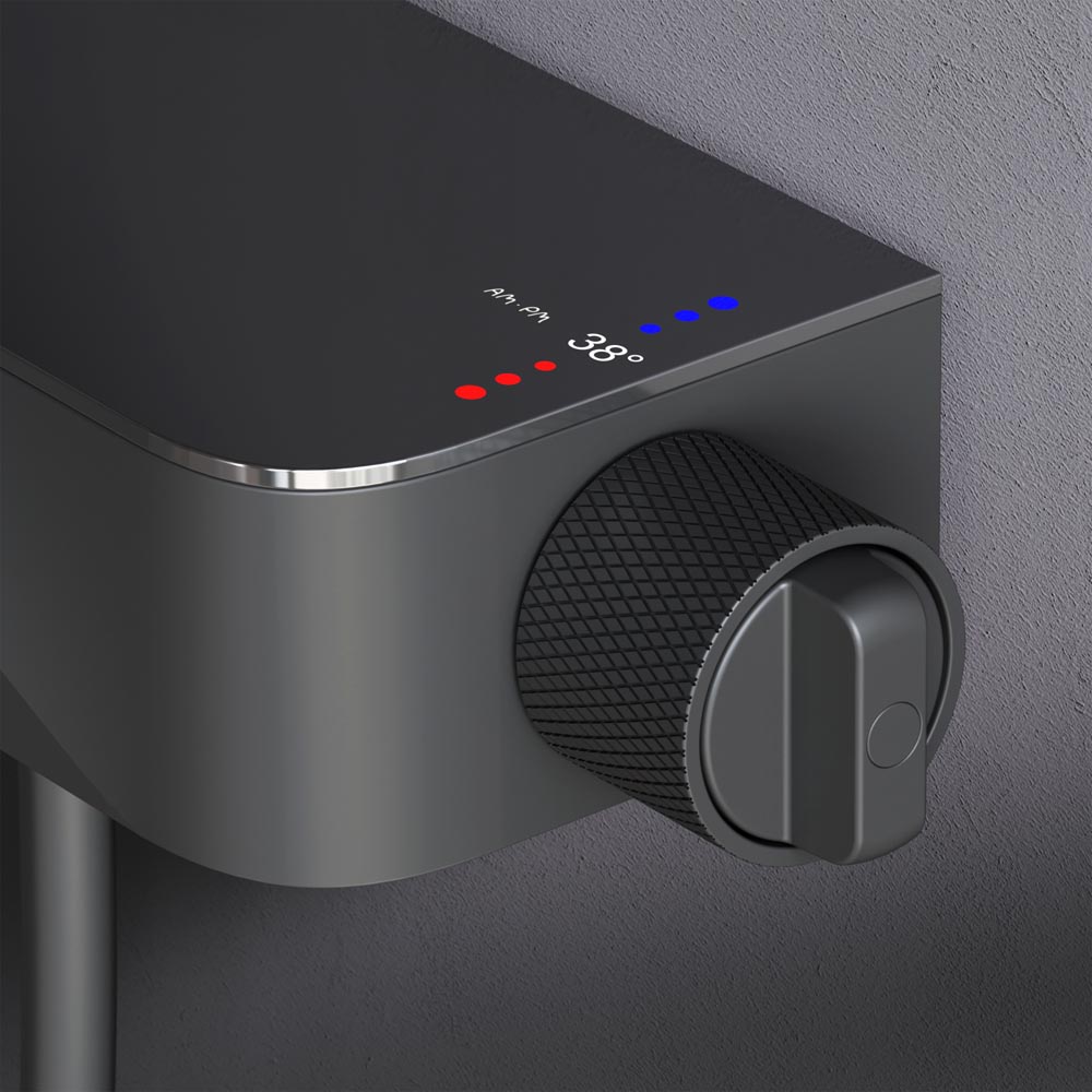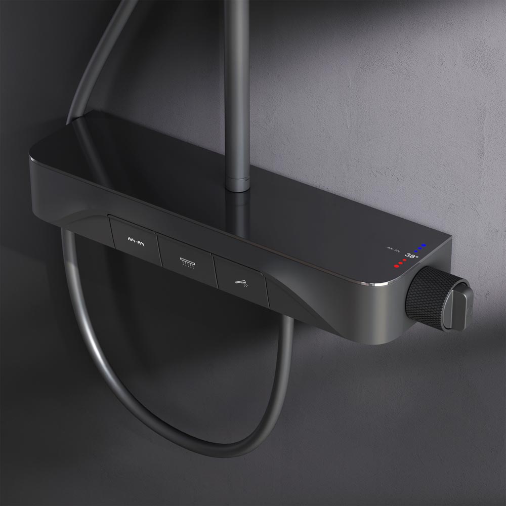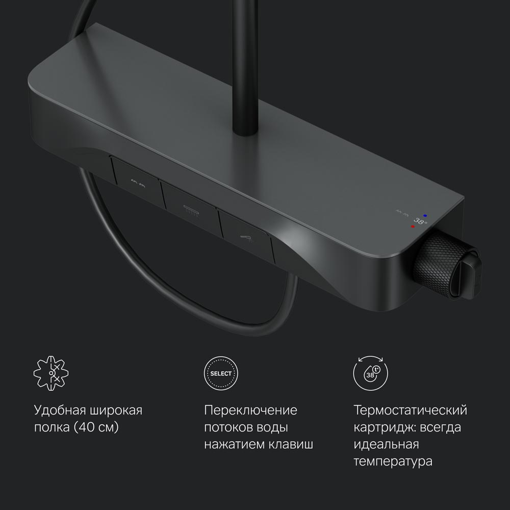 Интуитивно понятное управление: всего одна удобная ручка для настройки температуры и потока воды. Ручка дополнена инновационным антискользящим покрытием которое позволяет комфортно управлять душевой системой даже с мыльными руками. Переключение потоков воды осуществляется нажатием клавиши.