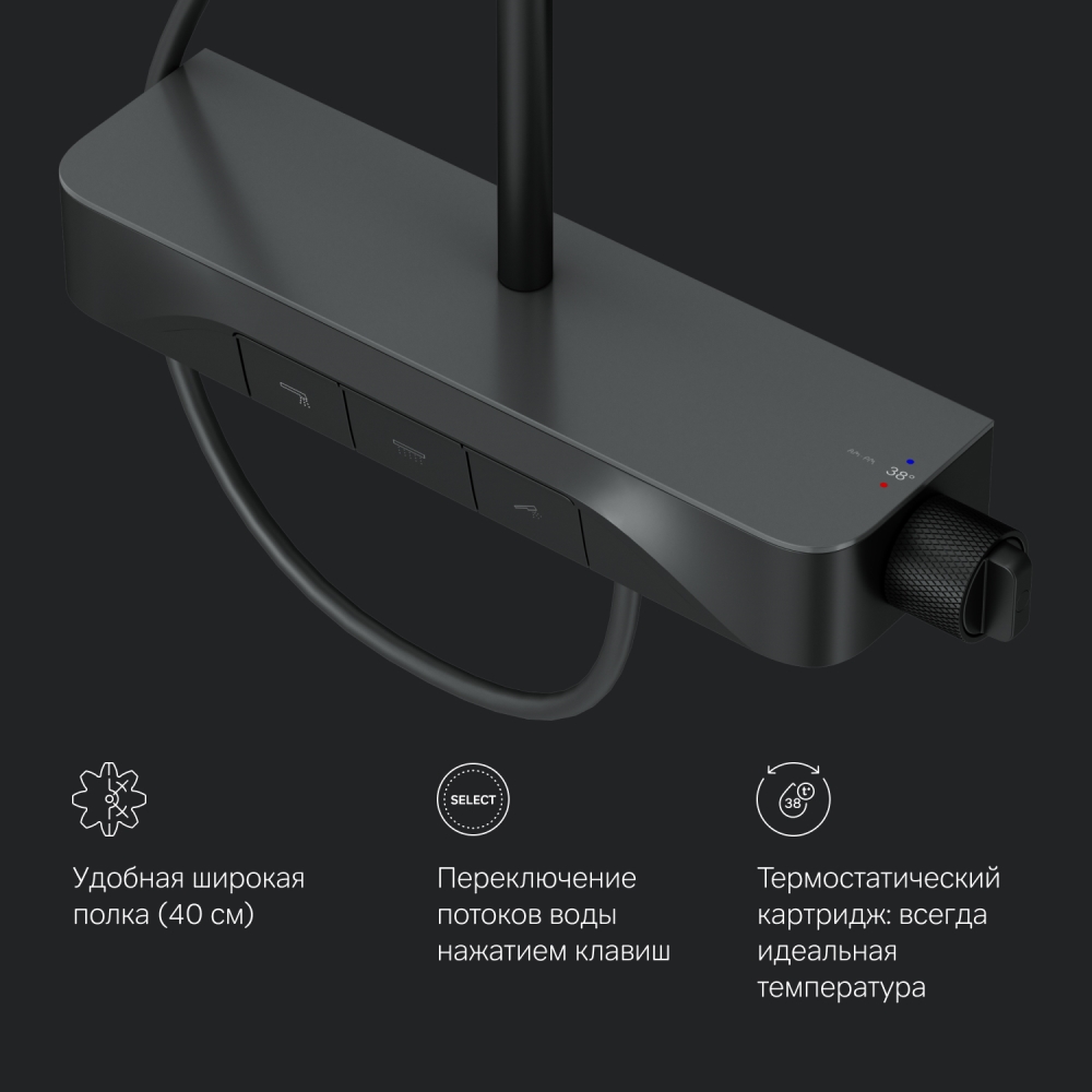 Еще больше места для хранения: смеситель выполнен в виде вместительной полочки. Внушительный размер полки (40 см.) позволяет хранить все любимые средства под рукой а эстетичный силуэт станет настоящим украшением современной ванной комнаты.